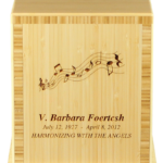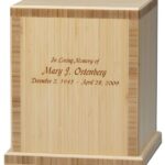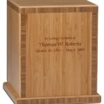 This Bamboo is plantation grown and is not a species that is consumed by endangered Panda populations. Each urn features a Green-certified and LEED-compliant (Leadership In Energy and Environmental Design) water-based finish. Base affixes with recycled steel screws. The front and top of the urn can be personalized with three lines of text and select clip art images.